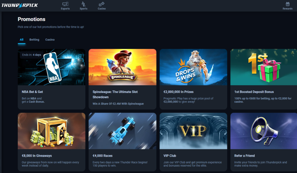 Ongoing promotions keep the action hot: IEM Bet & Get (cash rewards on IEM Kraków Playoffs), Spinoleague (€2.4M+ prize pool), Drops & Wins (Pragmatic Play’s €2M prize drops), Weekly Giveaways (€8,000 every week), Thunder Races (€4,000 total rewards), VIP Club (exclusive perks), and Refer a Friend (bonuses per referral). Non-stop races, Pragmatic events, and tournament specials make it electric!