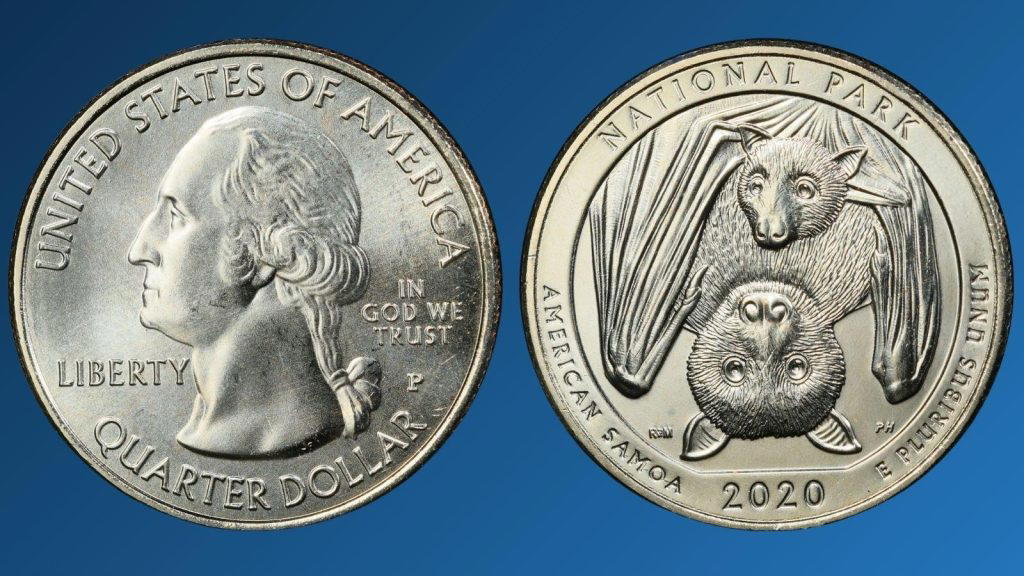 The “Faceless Bat” error represents the most famous mistake on 2020 American Samoa quarters, where debris or grease between the die and planchet obscured the mother bat’s face. This strike-through error blurs her eyes and cheeks, creating a distinctive appearance. MS 65 examples sell for approximately $200, while specimens with additional features like V75 privy marks command higher premiums between $50-500 depending on severity and grade.