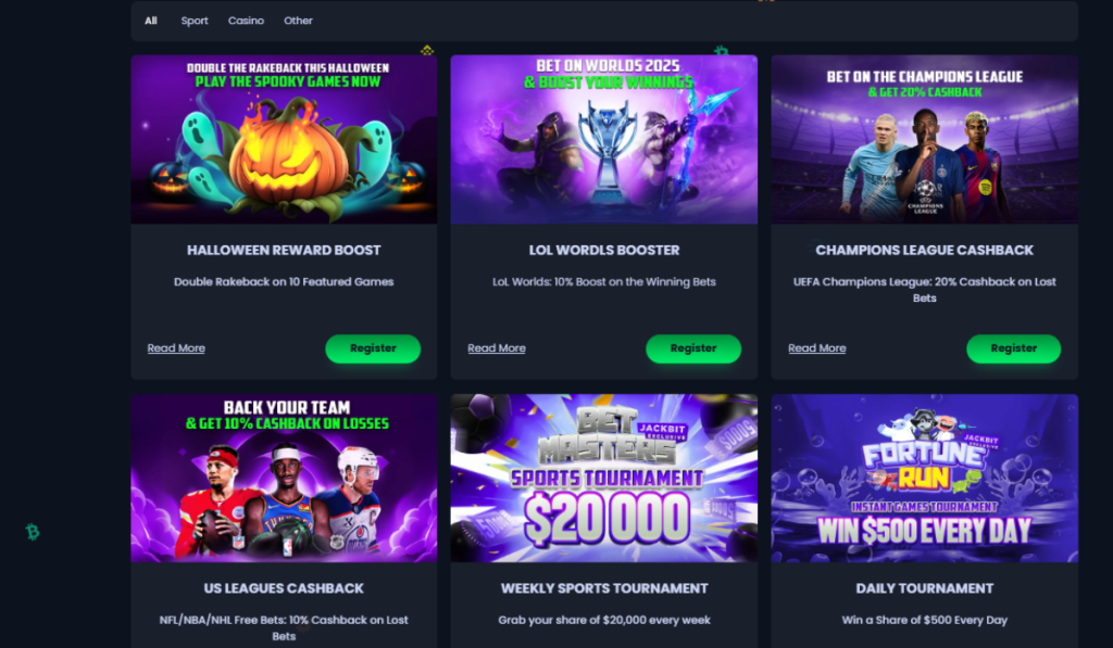 JACKBIT’s promotional offers can bring big wins. Claim the VIP rakeback to get up to 30% cashback or participate in tournaments like Bet Masters Weekly Sports Tournament, offering $20,000, or Fortune Run Instant Game Tournament worth $500 every day. Western Wager Tournament offers a weekly $10,000 prize, while Drops and Wins provides a chance to win a share of the massive 2,000,000 EUR. Get every fourth ticket as a gift in sports with a 3+1 Free Bet or get 10% cashback as a free bet with Bet Insurance.
