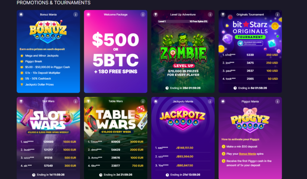 Level Up Adventure offers $70,000, while you get $5000 cash pool with the Originals Tournament. Piggyz Mania offers Piggyz of up to $50,000, while you can win up to $5000 and 5000 free spins with Slot Wars, or get $10,000 with Table Wars. BitStarz VIP club is one of the best VIP programs in the entire gambling industry, offering instant withdrawals, personalized assistance, early game access, etc.