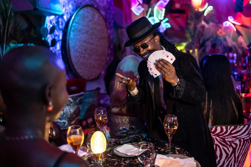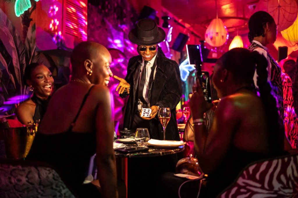 (FILES) Nigerian professional magician, Felven Brain, performs in front of patrons sitting at a table at the Zaza restaurant and lounge in Lagos, on August 24, 2025. Scantily clad in a sequin leotard and silver heels, the dancer swayed to “Money” by Cardi B in a mega-sized cocktail glass.
