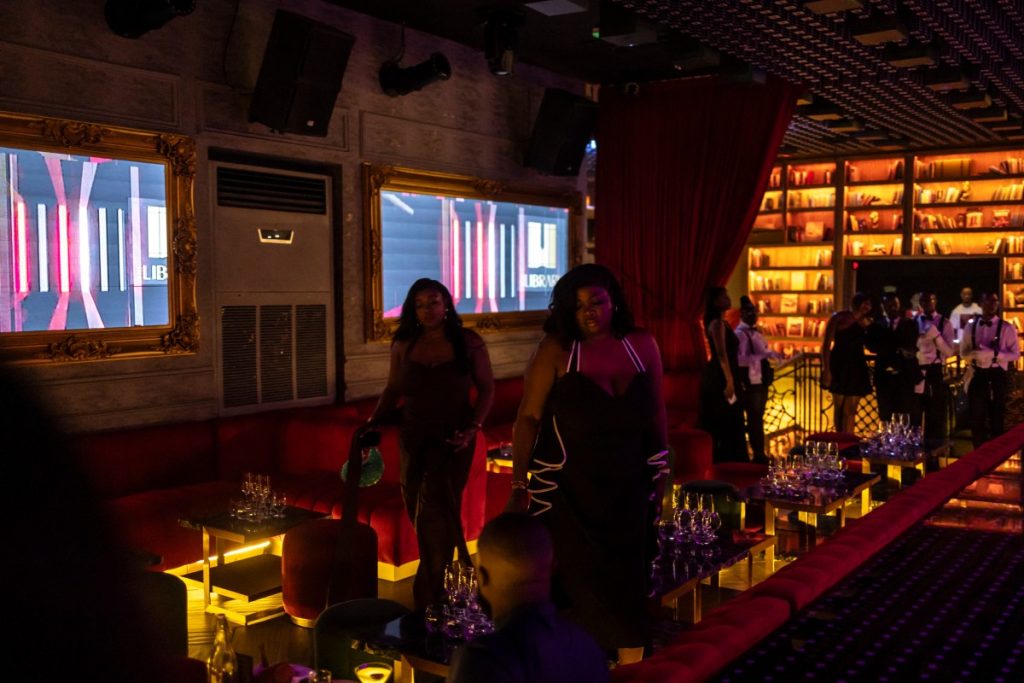 (FILES) Patrons walk to their table inside The Library restaurant and club in Lagos, on September 6, 2025. Scantily clad in a sequin leotard and silver heels, the dancer swayed to “Money” by Cardi B in a mega-sized cocktail glass.