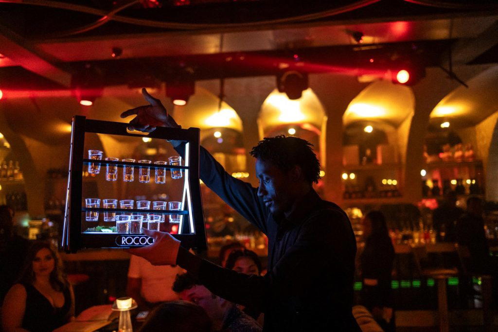 (FILES) A waiter brings drinks to customers at the Rococo Restaurant, Lounge and Club in Lagos, on March 21, 2025. Scantily clad in a sequin leotard and silver heels, the dancer swayed to “Money” by Cardi B in a mega-sized cocktail glass.