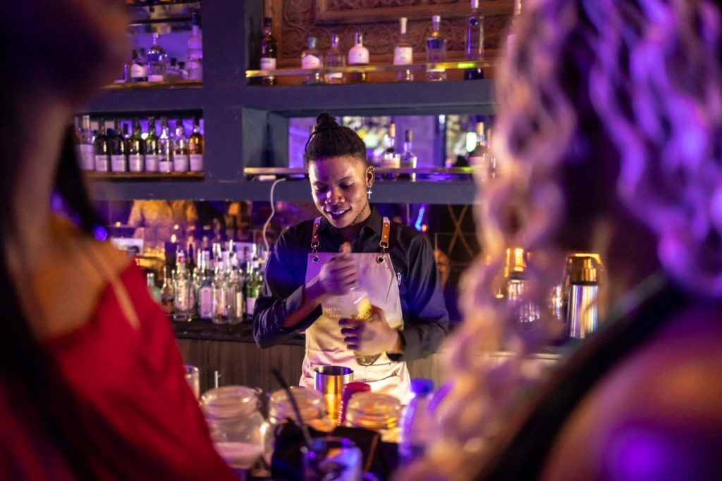 (FILES) A bartender prepares a cocktail as partygoers dance during an electronic music party organised by the “Lagos Underground” collective at the Mantra restaurant lounge in Lagos, on August 10, 2025. The hotels are booked and final preparations for the festivals and concerts are under way, as Lagos prepares for “Detty December”, Nigeria’s end-of-year frenzy.