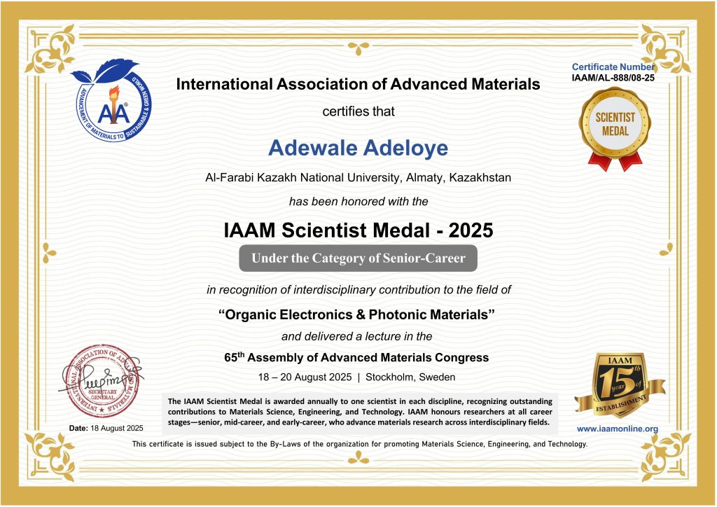 NIGERIA — Nigeria’s scientific community is celebrating a landmark achievement as Professor Adewale Olufunsho Adeloye has been awarded the prestigious IAAM Scientist Fellow Medal by the International Association of Advanced Materials (IAAM) in Stockholm, Sweden.