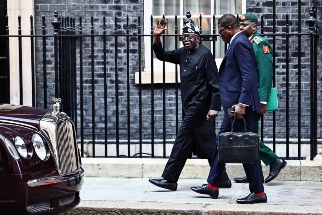 Nigeria’s President Bola Tinubu (L) waves following his meeting with Britain’s prime minister at 10 Downing Street in central London on March 19, 2026, on the second day of a two-day state visit. (Photo by Henry NICHOLLS / AFP)