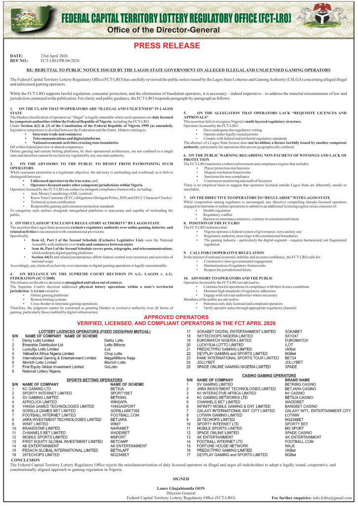 The Federal Capital Territory Lottery Regulatory Office rejects the mischaracterisation of duly licensed operators as illegal and urges all stakeholders to adopt a legally sound, cooperative, and constitutionally aligned approach to gaming regulation in Nigeria.