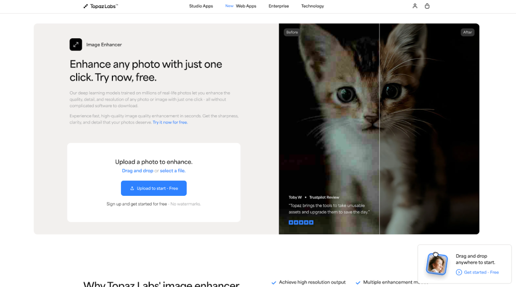 Topaz photo enhancer has earned popularity from many professionals and individuals looking for powerful photo enhancement tools. It takes simple sharpness correction a few steps further by utilizing AI to eliminate noise, correct blur, and recover minor details. It can enhance images by 600 percent, making it well-suited to larger prints and high-resolution projects.