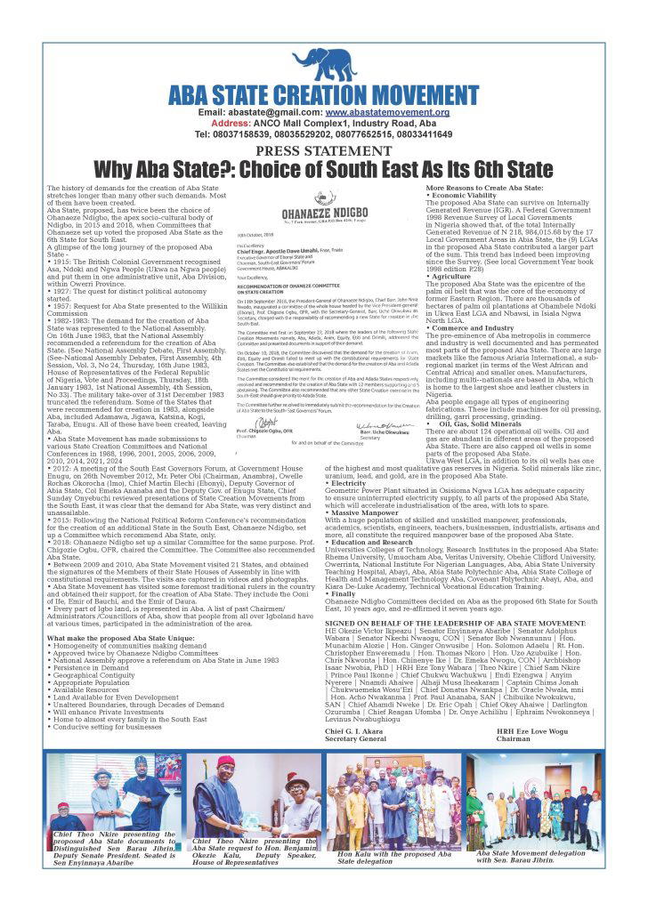 Aba State, proposed, has twice been the choice of Ohanaeze Ndigbo, the apex socio-cultural body of Ndigbo, in 2015 and 2018, when Committees that Ohanaeze set up voted the proposed Aba State as the 6th State for South East.